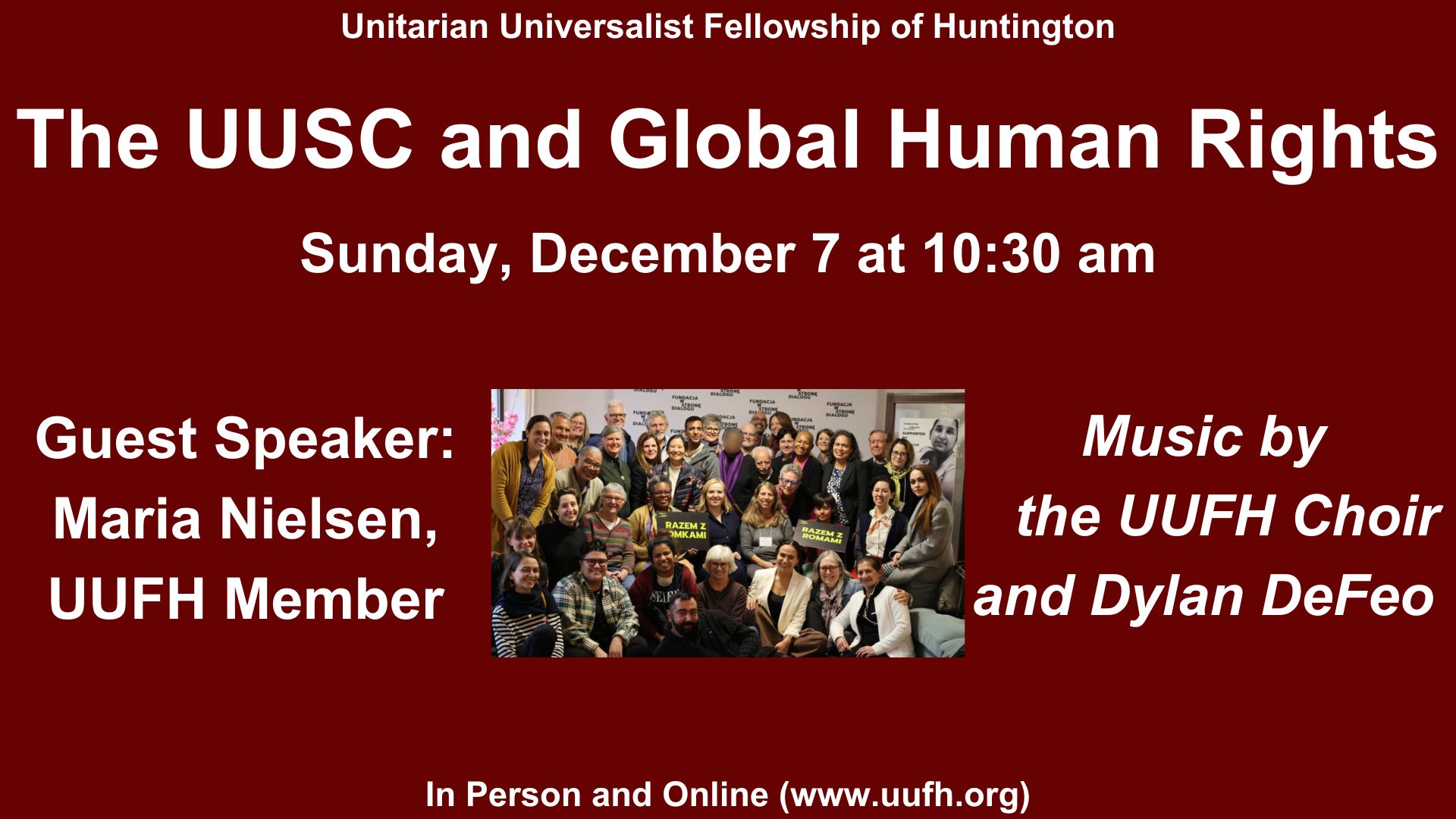 You may be familiar with the Guest at Your Table boxes sponsored by the Unitarian Universalist Committee — a tradition we’d like to revive at UUFH — but did you know that the UUSC supports human rights projects all over the world? Maria Pignataro Nielsen recently completed a 6-year term on the UUSC Board of Directors, and in honor of International Human Rights Day (annually on December 10th), she’ll speak to us about the work of UUSC at the December 7th service, including her travels with the Board and a slideshow of images from UUSC’s global work.