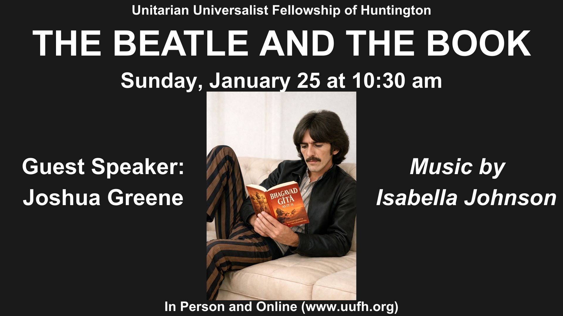 Join educator Joshua M. Greene for a fascinating journey into favorite songs by George Harrison. The late Beatle wove ideas from the wisdom text Bhagavad Gita into singable lyrics—a beautiful example of UU principles of pluralism and love.